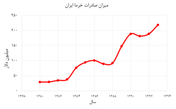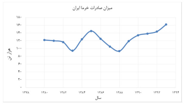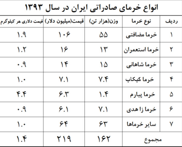 صادرات خرمای ایران به طور کلي در 7 دسته مضافتي، استعمران، شاهاني، کبکاب، پيارم، زاهدی و سایر خرماها گزارش ميشود که در این ميان خرمای مضافتي سهم عمدهی صادرات خرمای کشور را به خود اختصاص داده است. همچنين خرمای پياروم با ميانگين قيمت 4٫4 دلار به ازای هرکيلوگرم، گران ترین خرمای صادراتي ایران محسوب ميشود. در جدول زیر صادرات انواع خرمای ایران در سال 1392 نشان داده شده است